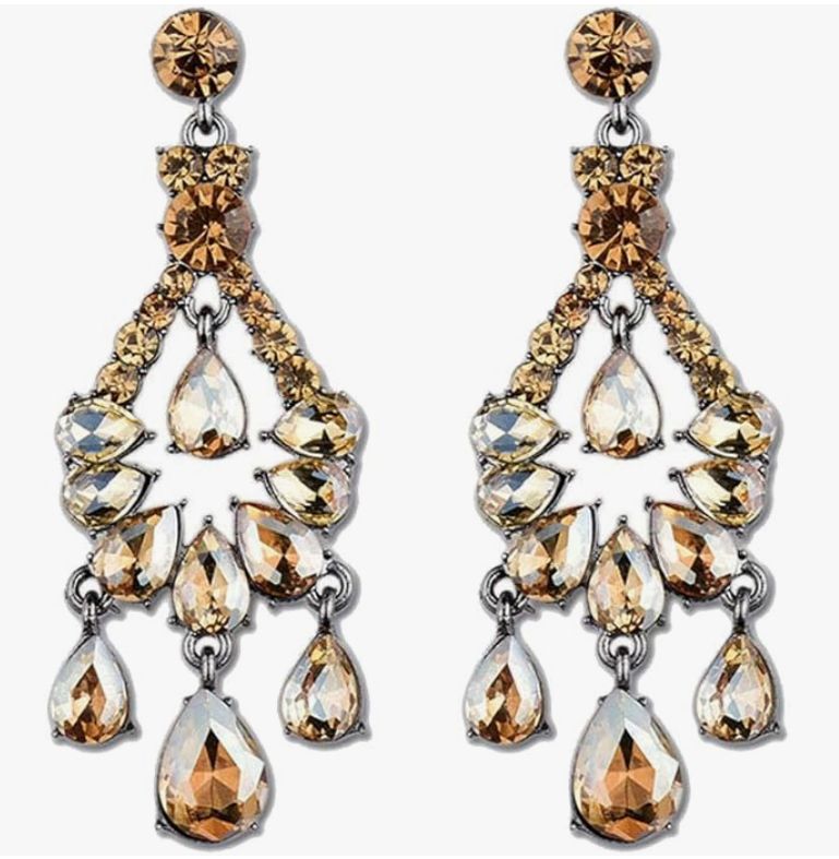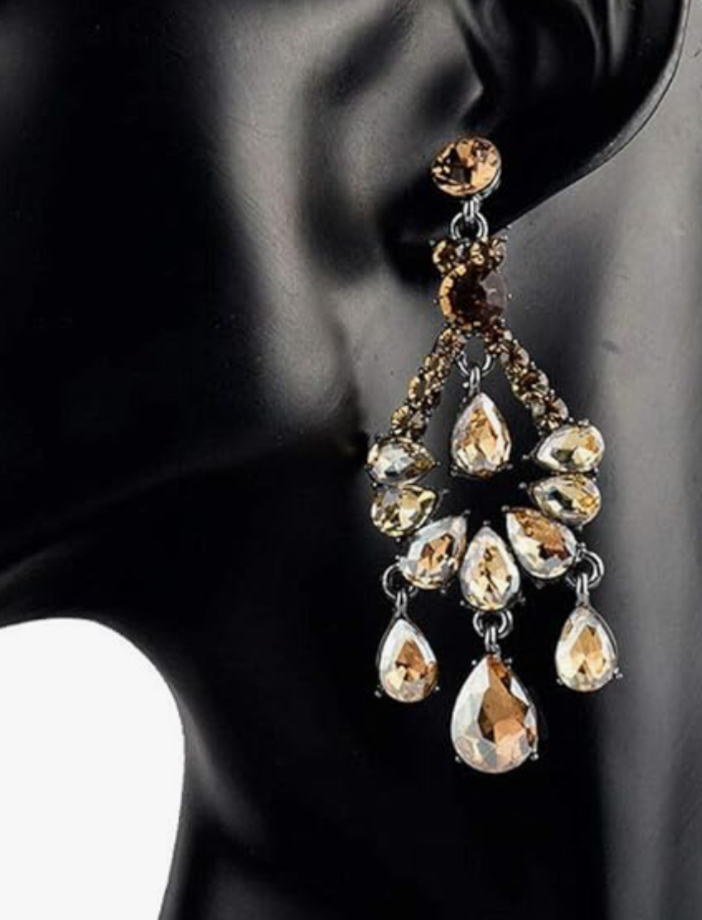 Gorgeous amber Swarovski Crystal Elements create these sumptuously elegant earrings. They dangle a perfect 3.2″ in length. Fashion jewelry for Real Housewives