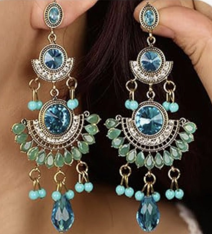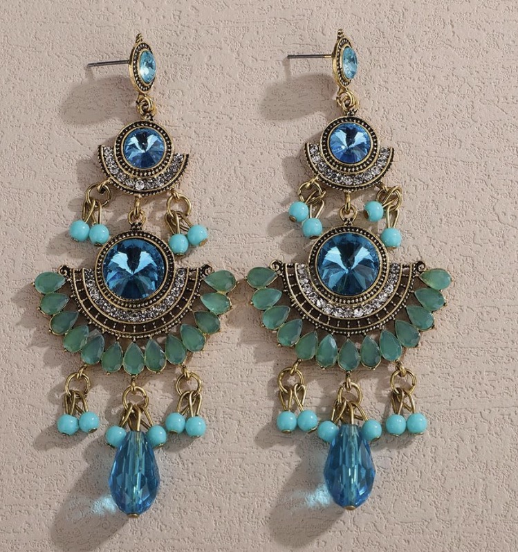 Send your camel to bed and hit the town in these fabulous chandelier earrings! A perfect combination of blue, green, and turquoise Swarovski Crystals and acrylic beads create these statement makers. A perfect 3” long. Real Housewives style at its best! Look seen on Real Housewives of New York, Luann de Lesseps and Rachael Zoe of Real Housewives of Beverly Hills.